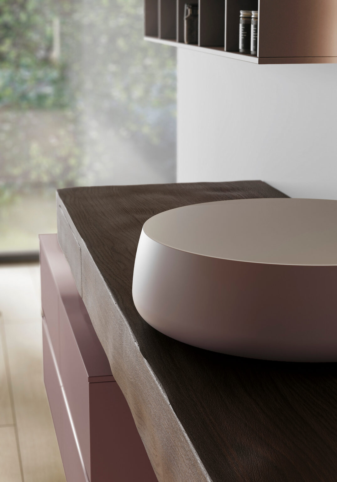 Aufsatzwaschbecken Beauty aus Cristalplant® (weiß matt, oder nur außen oder ganz in den matten Farben von Ideagroup und in Metal Color – Metal Color nur außen), ohne Überlauf. Erhältlich für gerade Waschtischplatten mit einer Tiefe von 36 cm und 45,5 cm.