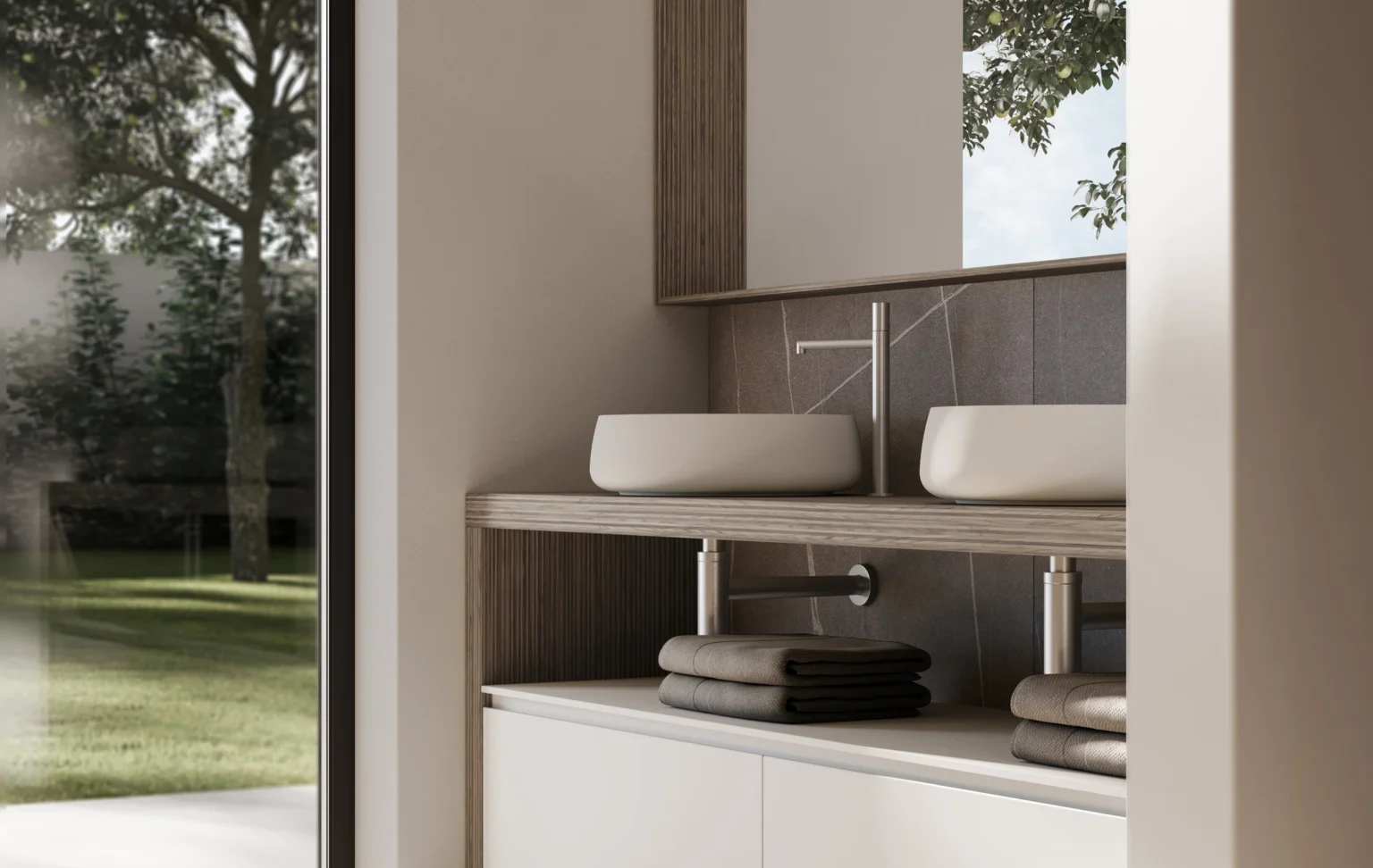 Das Material Cristalplant® ist für seine natürlich schöne Steinoptik mit Soft-Touch-Oberfläche bekannt. Es besteht zum größten Teil aus hochreinen Aluminiumhydroxid-Mineralfüllstoffen, die durch Biobased® Harze mit pflanzlichem Ursprung (Mais) gebunden sind. Es ist widerstandsfähig und aufgrund von Photokatalyse antibakteriell. Kratzer, Schrammen und Vergilbungen können langfristig beseitigt werden und es ist am Lebensende recycelbar.