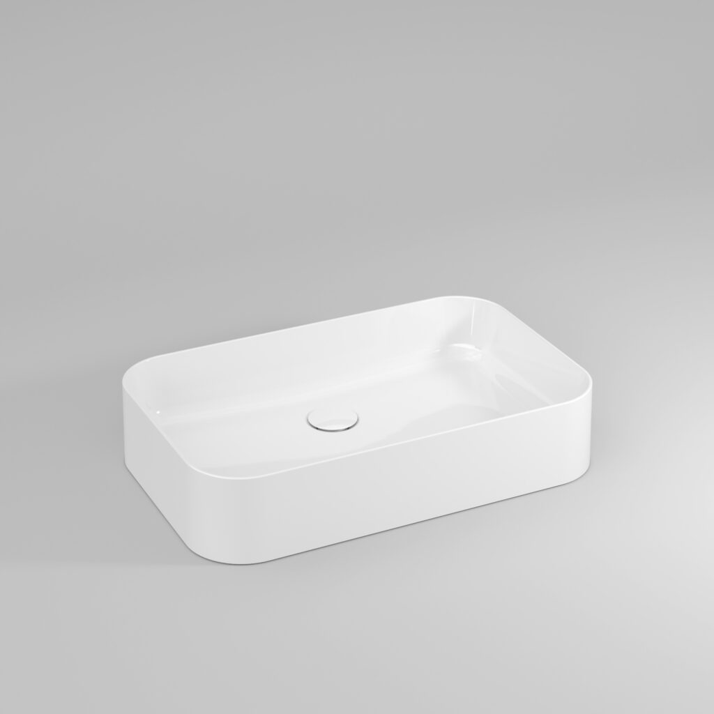 Aufsatzwaschbecken Slim aus glänzend weißer Keramik, ohne Überlauf.