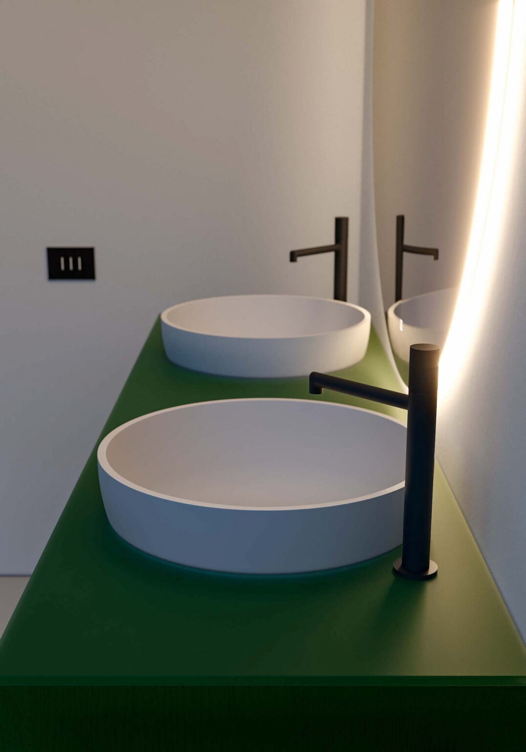 Einbauwaschbecken Bacinella aus matt weißem Aquatek. Ohne Überlauf, mit offener Ablaufgarnitur in der gleichen Ausführung. Erhältlich für gerade Waschtischplatten.