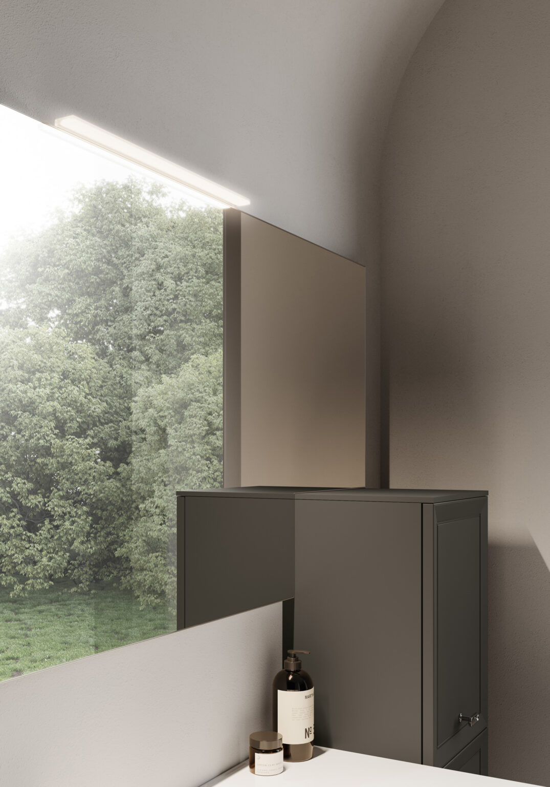 Rechteckiger geformter Spiegel Elmas H. 70 mit Rahmen in der Ausführung Chrom hochglanz. Kompatibel zu Leuchten Cubik, Double, Lido, Reflex, RS, Strip, Symply, Time, Web und Piuma.