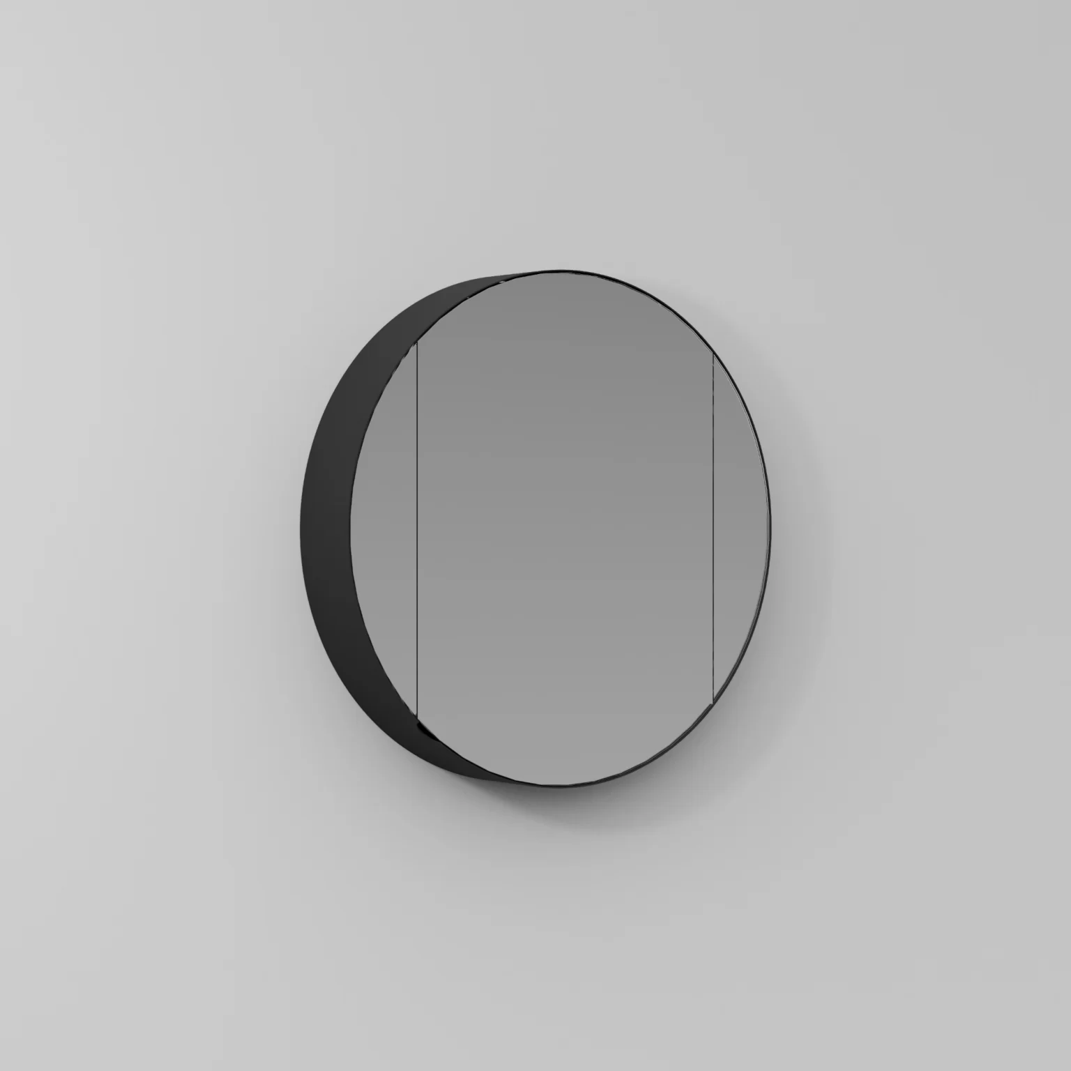 Spiegelschrank Giotto mit schwarzem Aluminiumrahmen innen, verspiegelter Rückwand und Metallrahmen außen. 1 Tür rechts/links und vier Fachböden.