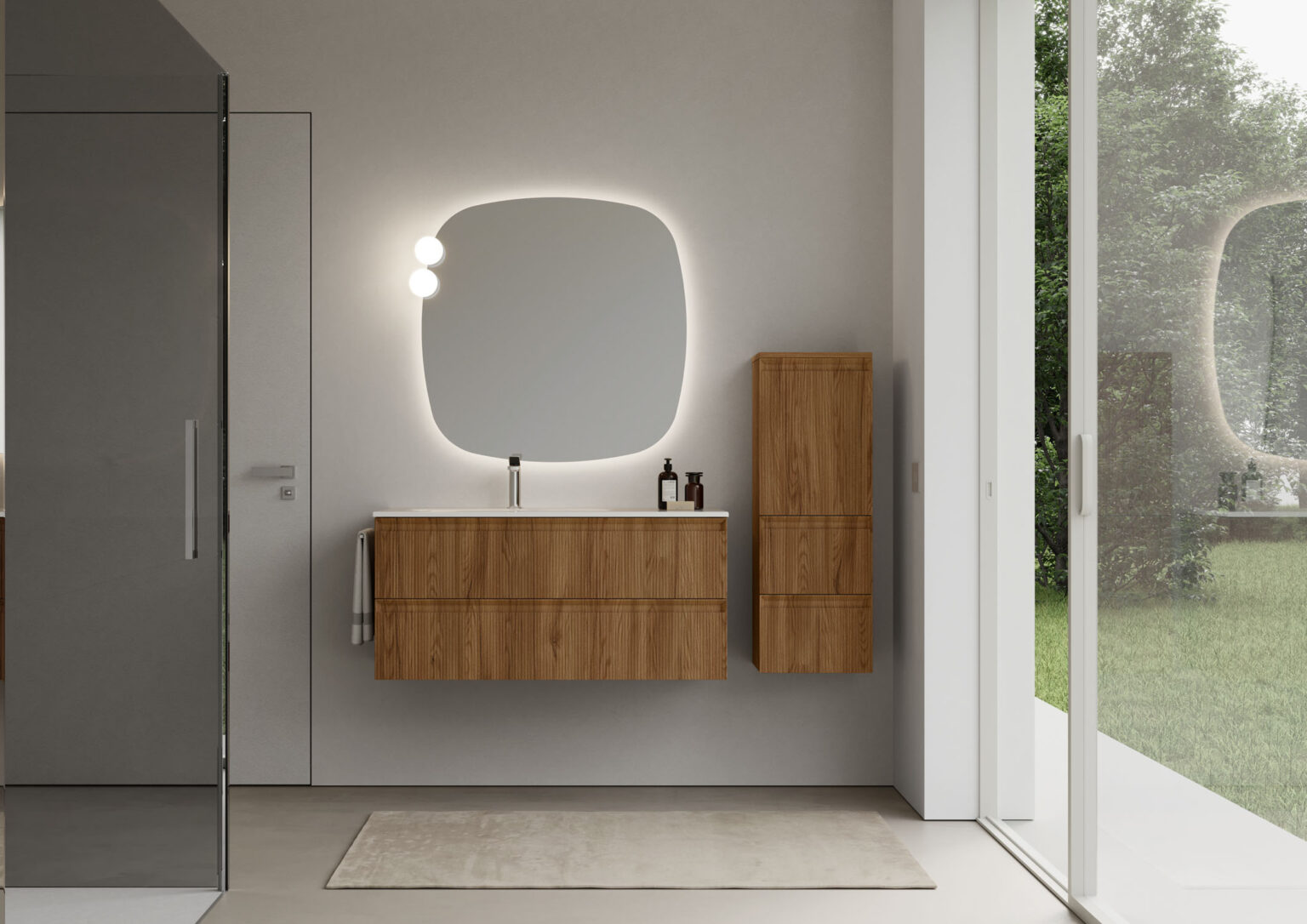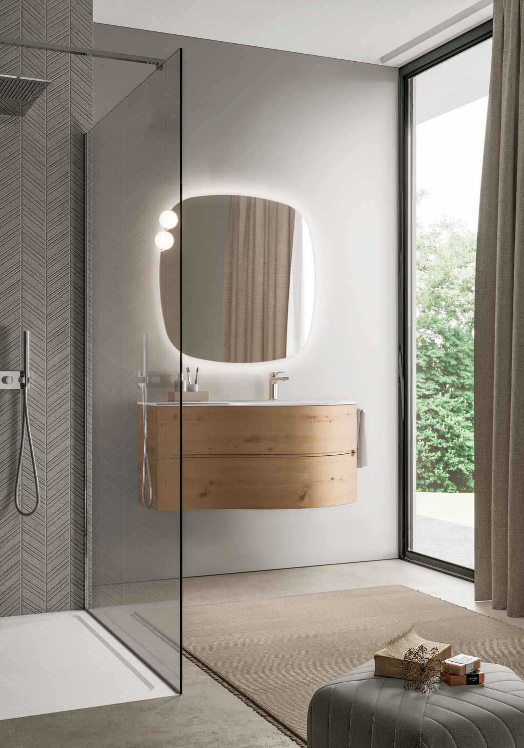 Der mit LED hinterleuchtete Spiegel Move hat eine weiche, organische Form und eine runde, polierte Kante. Er ist in einer Größe erhältlich und kann mit der kugelförmigen Leuchte Scarlet kombiniert werden, die am Spiegel eingerastet werden kann und in einer Größe erhältlich ist. Sie ist mit LED-Beleuchtung ausgestattet und in verchromter oder schwarzer Ausführung erhältlich. IP44 – 3000 K oder 4000 K W von 25 bis 34,5 – Lm von 2827 bis 3236 Sonderzubehör: Touch On-Off Funktion und Farbtemperaturwechsel 2700/4000 K.
