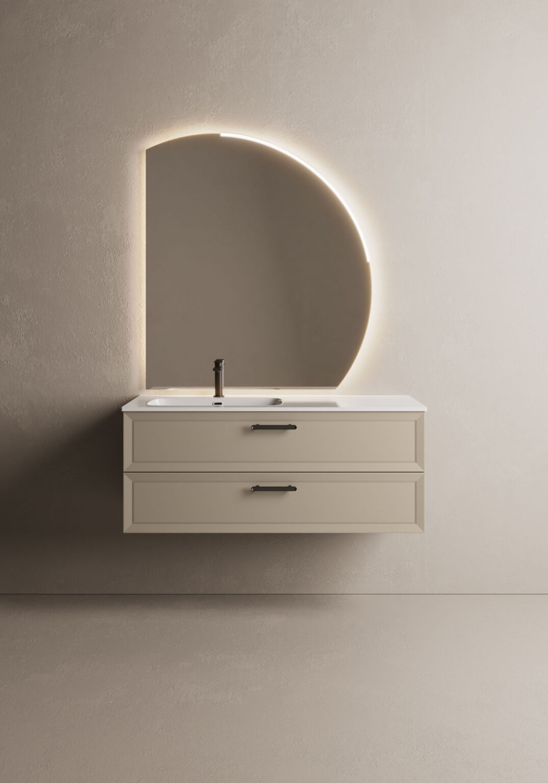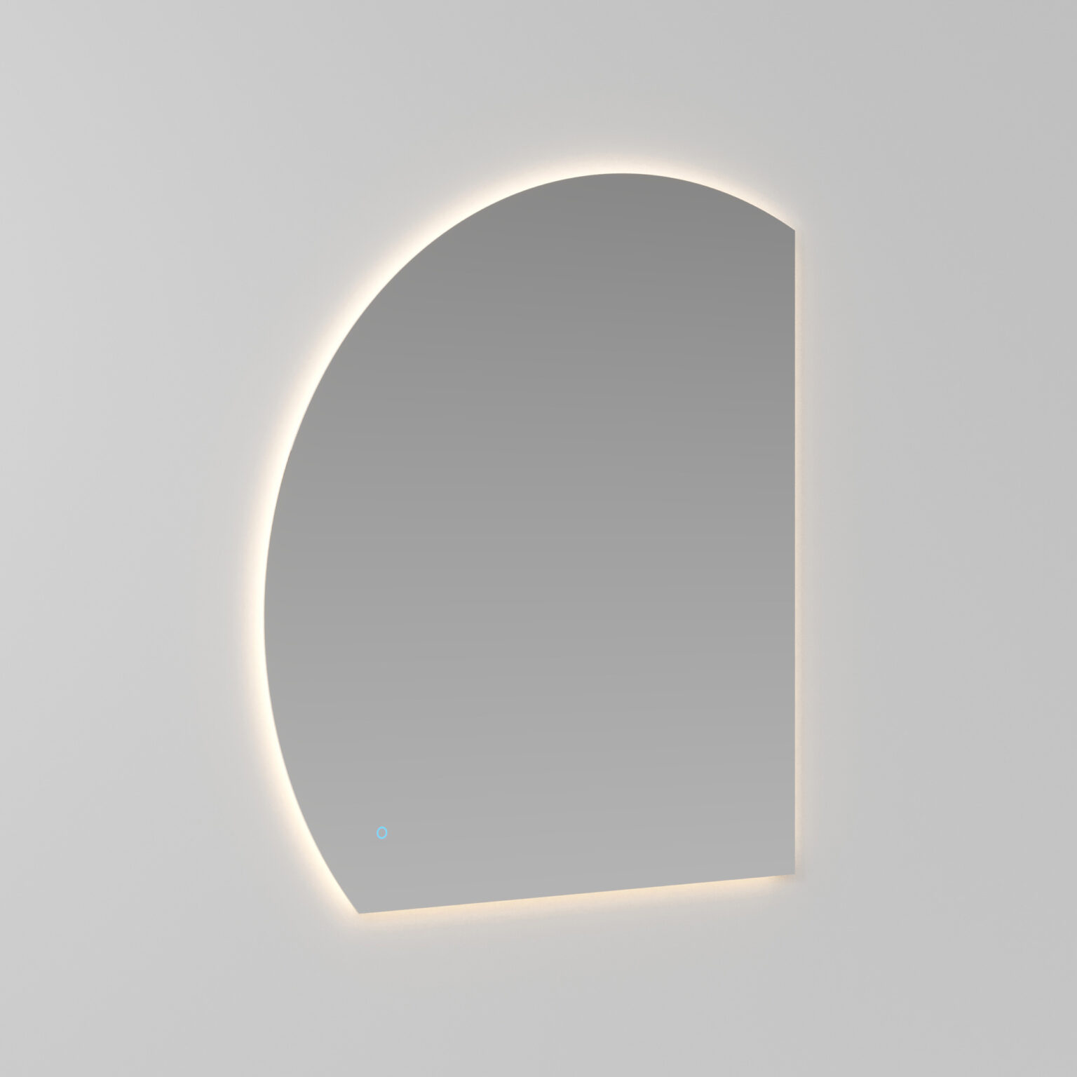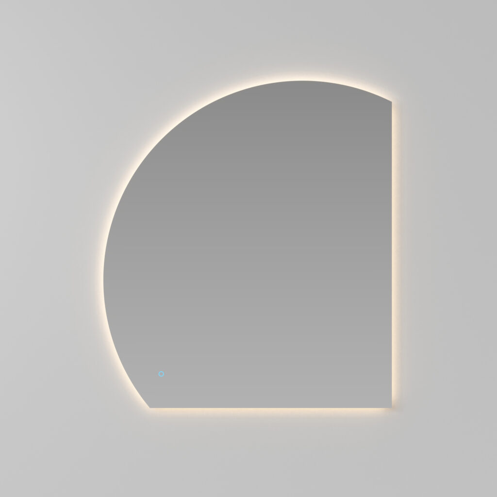 Geformter Spiegel Lunetta mit abgerundeter, polierter Kante. Rechts- oder linksseitig erhältlich. LED-hinterleuchtet. Kompatibel nur zu den Leuchten Arko 140 und Scarlet. IP55 – 3000 K oder 4000 K W 27,3 – Lm 919