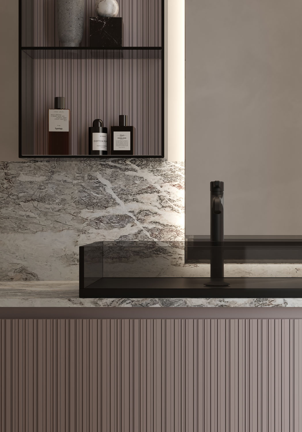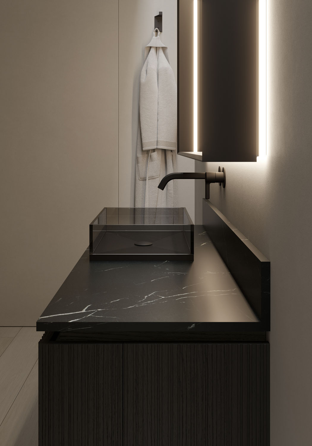 Rechteckiges Aufsatzwaschbecken aus glänzendem Rauchglas mit matt schwarzem Glasboden. Ohne Überlauf, erhältlich in zwei Größen (50 und 65 cm breit). Es kann mit Fachböden und offenen Fächern in der gleichen Ausführung kombiniert werden.