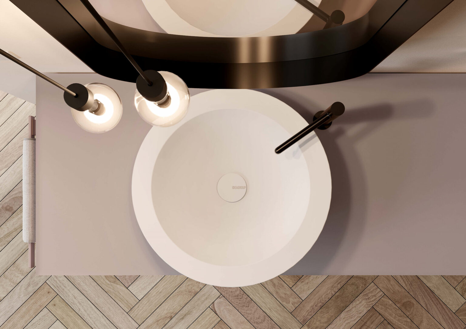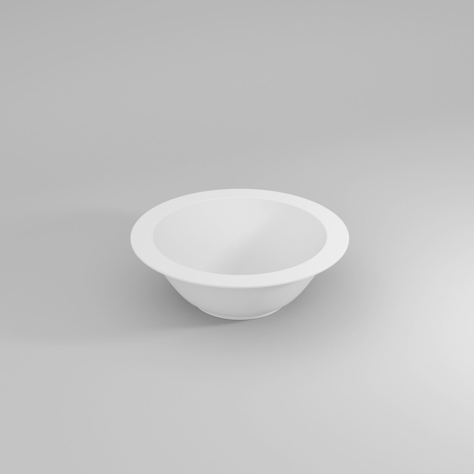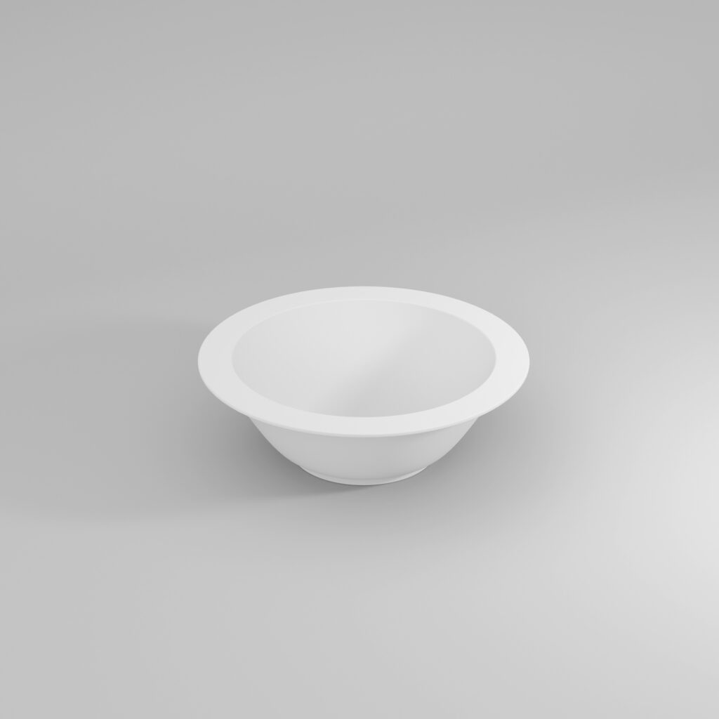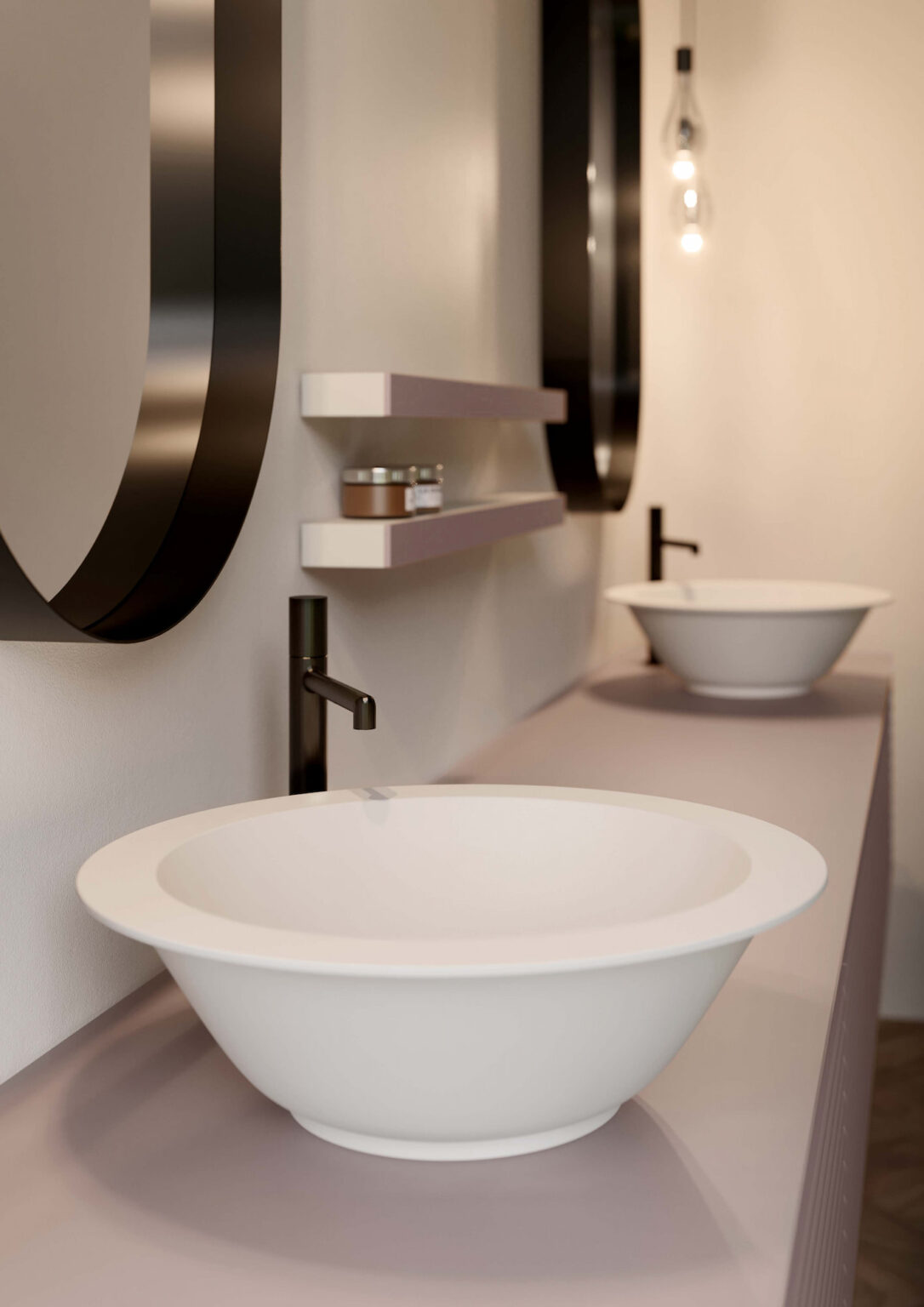 Aufsatzwaschbecken Marea aus glänzend weißer oder matt weißer Keramik. Ohne Überlauf, mit offener Ablaufgarnitur in der gleichen Ausführung. Erhältlich für gerade Waschtischplatten mit einer Tiefe von 45,5 cm.
