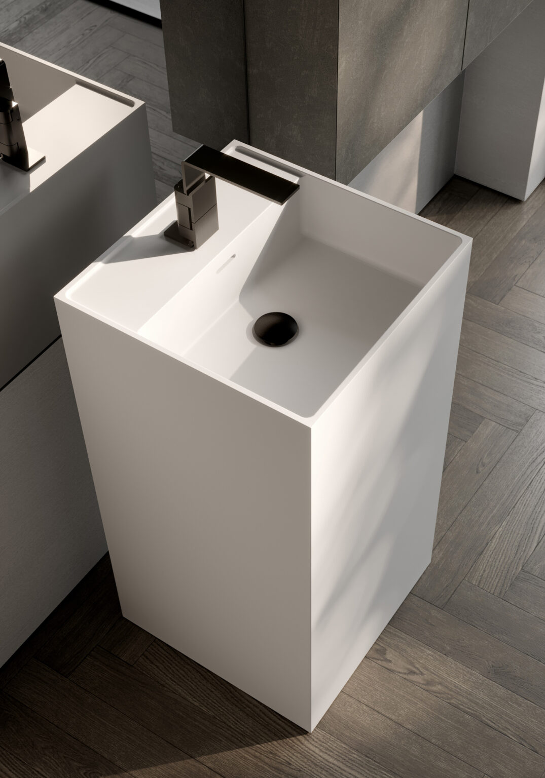 Standwaschbecken Quadro aus Cristalplant® (weiß matt, oder nur außen oder ganz in den matten Farben von Ideagroup und in Metal Color – Metal Color nur außen). Mit Hahnloch (auf Wunsch auch ohne) und Überlauf.
