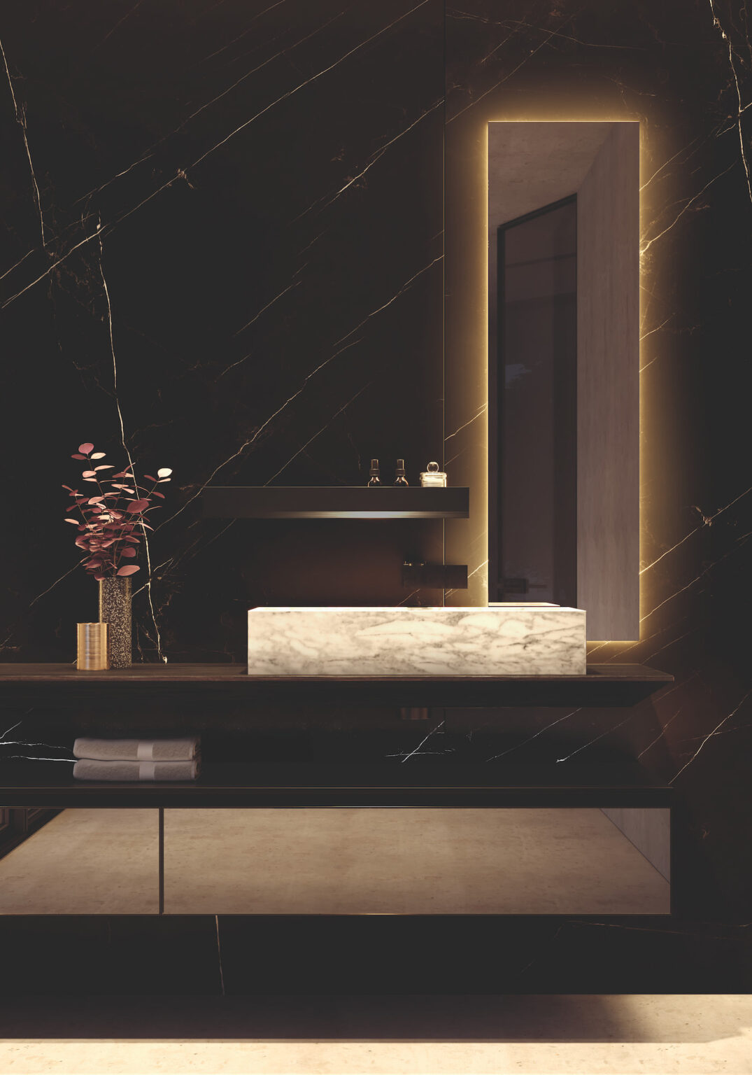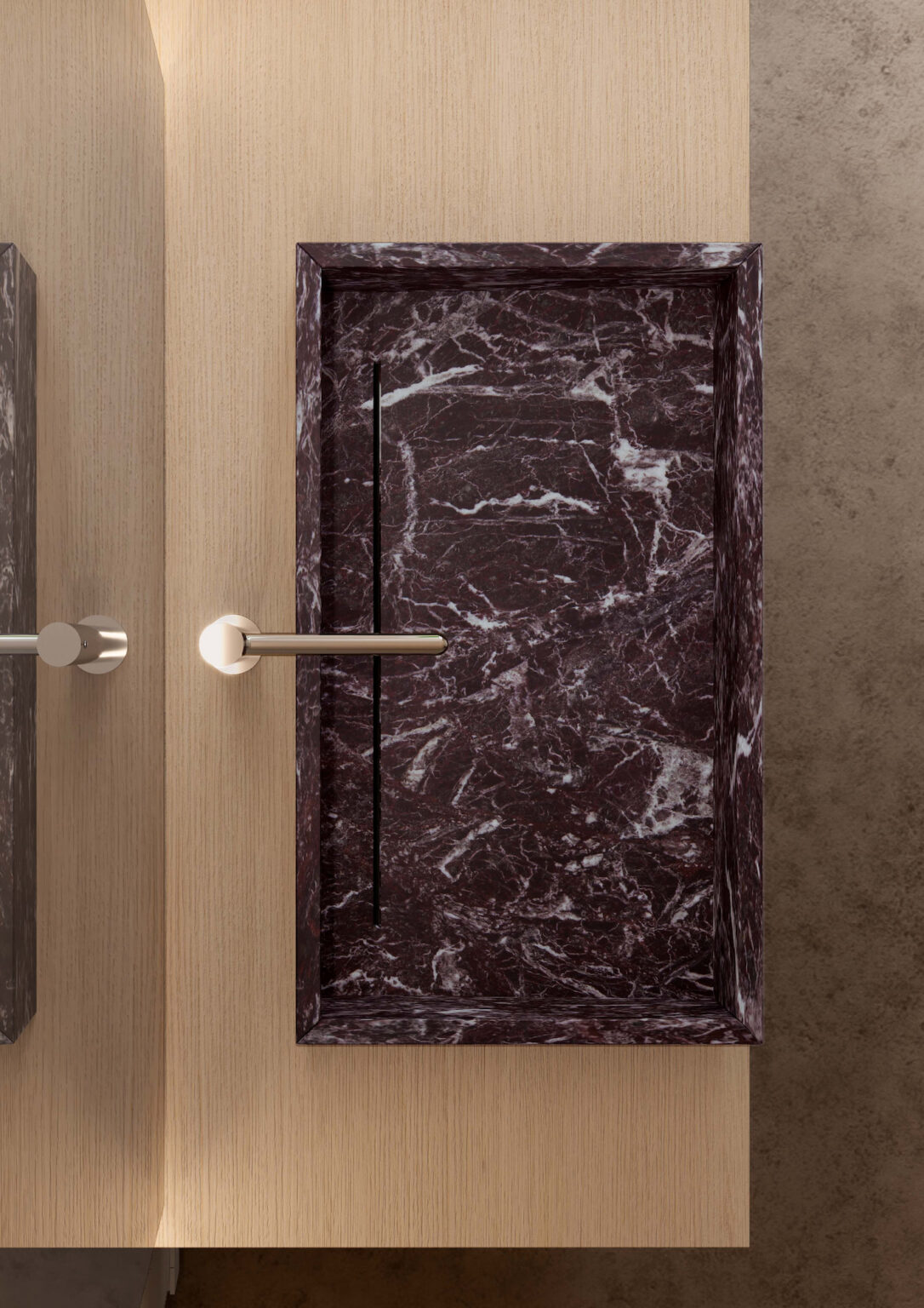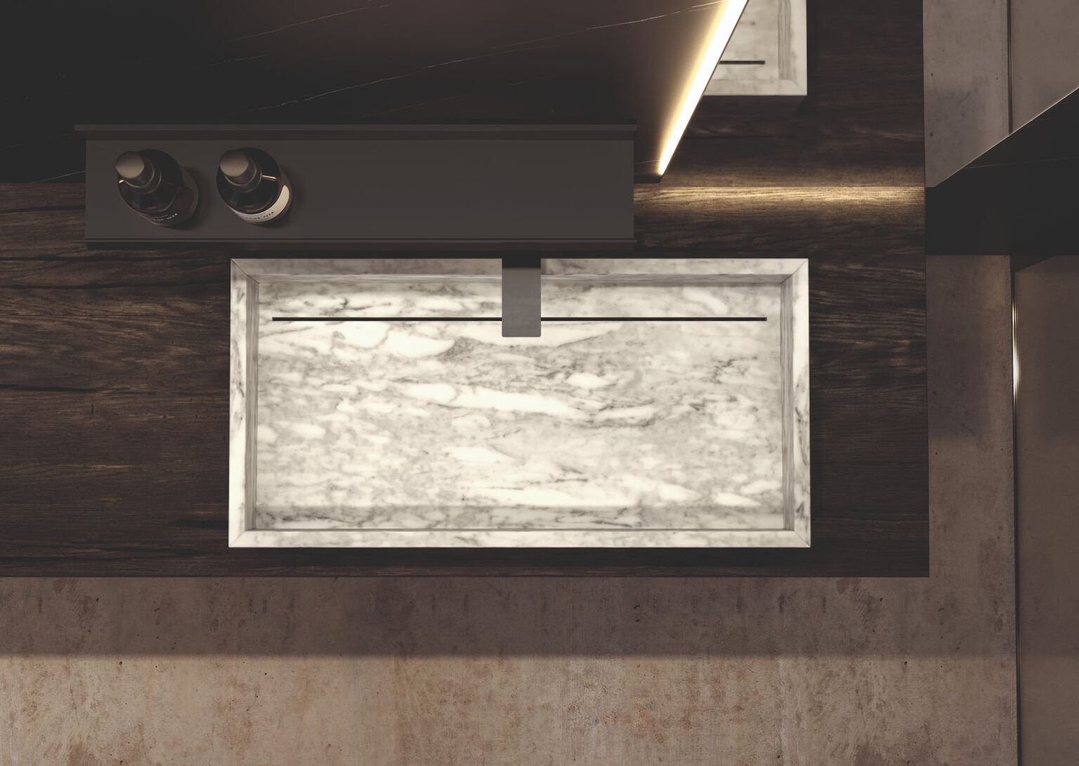 Aufsatzwaschbecken Slide aus glänzendem und mattem Naturmarmor, ohne Überlauf.