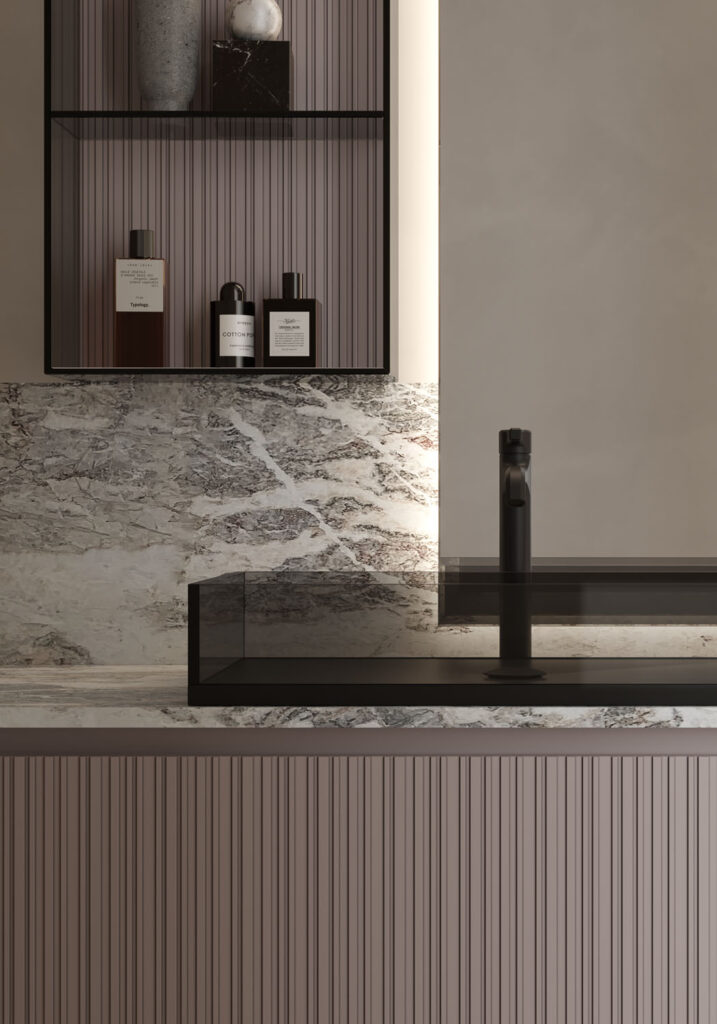 ViaCondotti ist die neue Badkollektion mit handwerklich hergestelltem, unregelmäßigem Rillenmuster, das an den Fronten und Seitenwänden der Schränke verläuft. Hier kommt die Dynamik in all...