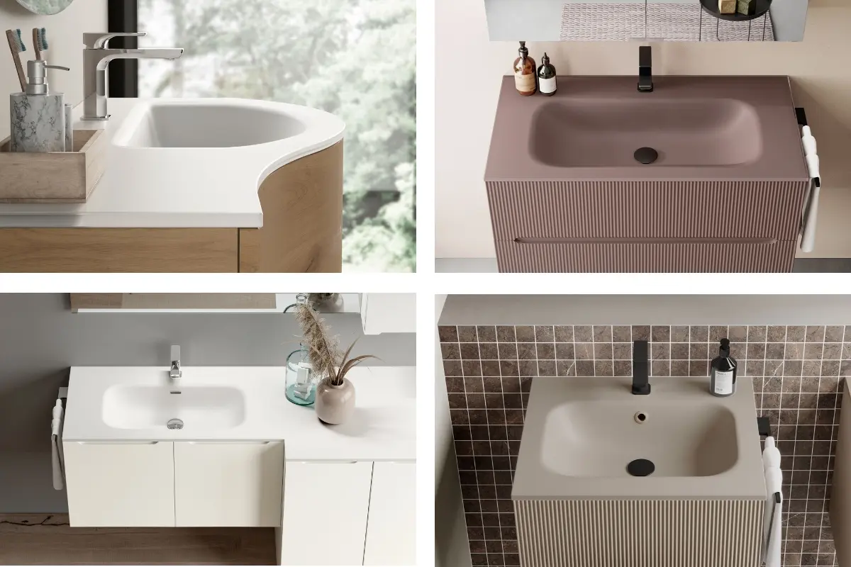 Die Waschtischunterschränke werden mit passenden Waschtischplatten aus Glas, Mineralsolid und Mineralux, auch in farbiger Ausführung, vervollständigt.