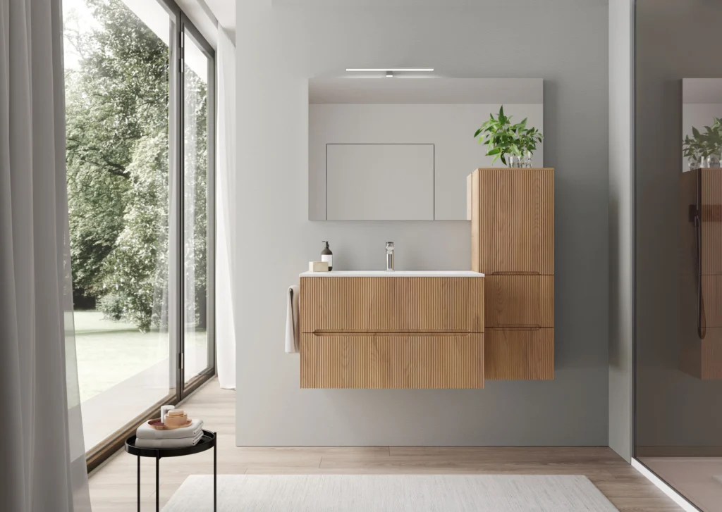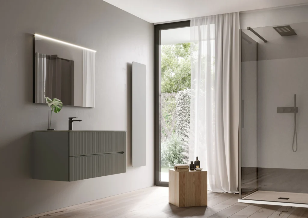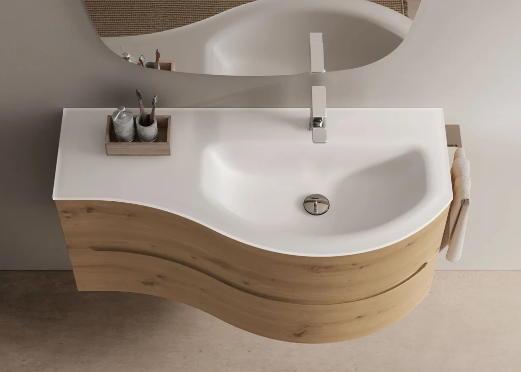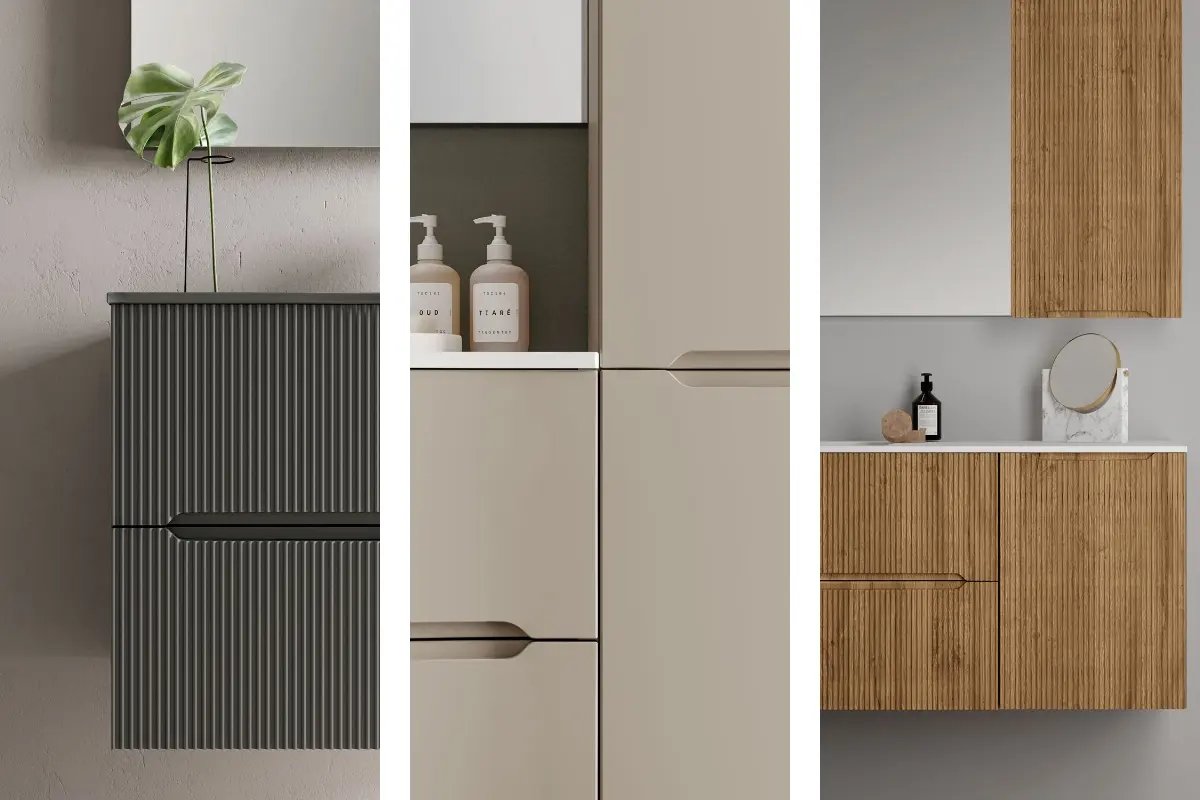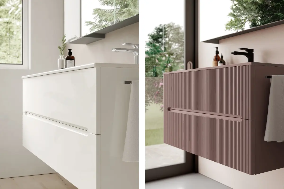 Die Front ist in drei Varianten erhältlich: glatt (Smyle Plan), mit Rillenmuster (Smyle Onda) oder gewölbt. Die Badkollektion Smyle vereint ansprechende Optik mit Funktionalität. Durch die vielfältigen Kombinationsmöglichkeiten und die klaren Linien können Planungsideen für ein modernes Bad umgesetzt werden, die sich jeder Raumsituation anpassen.