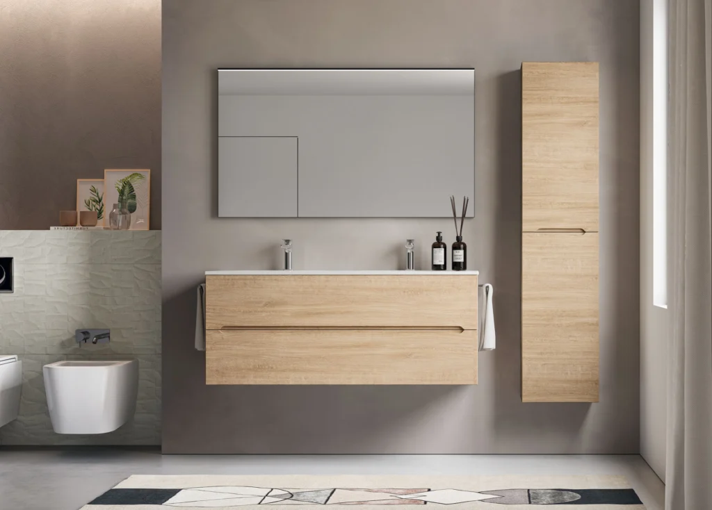 Die Badmöbel des Programms Smyle bestechen durch ihre einfache und vielseitige, modulare Bauweise sowie ihr mittig angeordnetes Griffprofil, das einen optischen Akzent setzt.