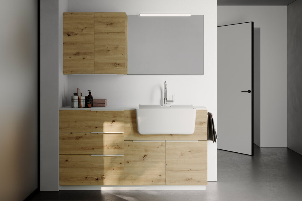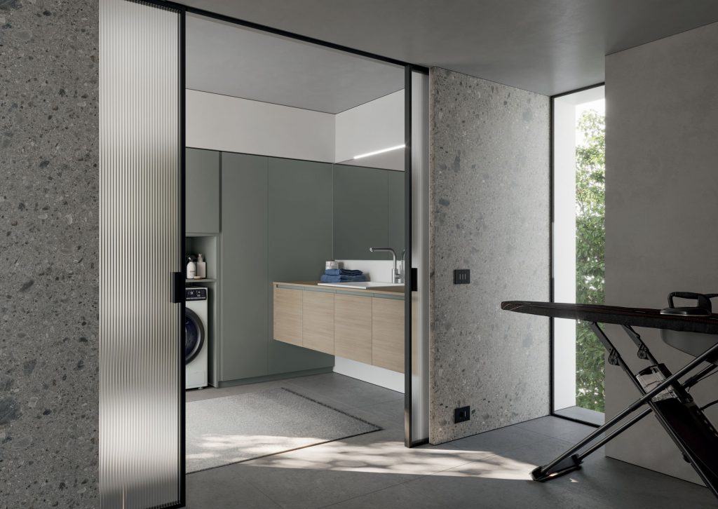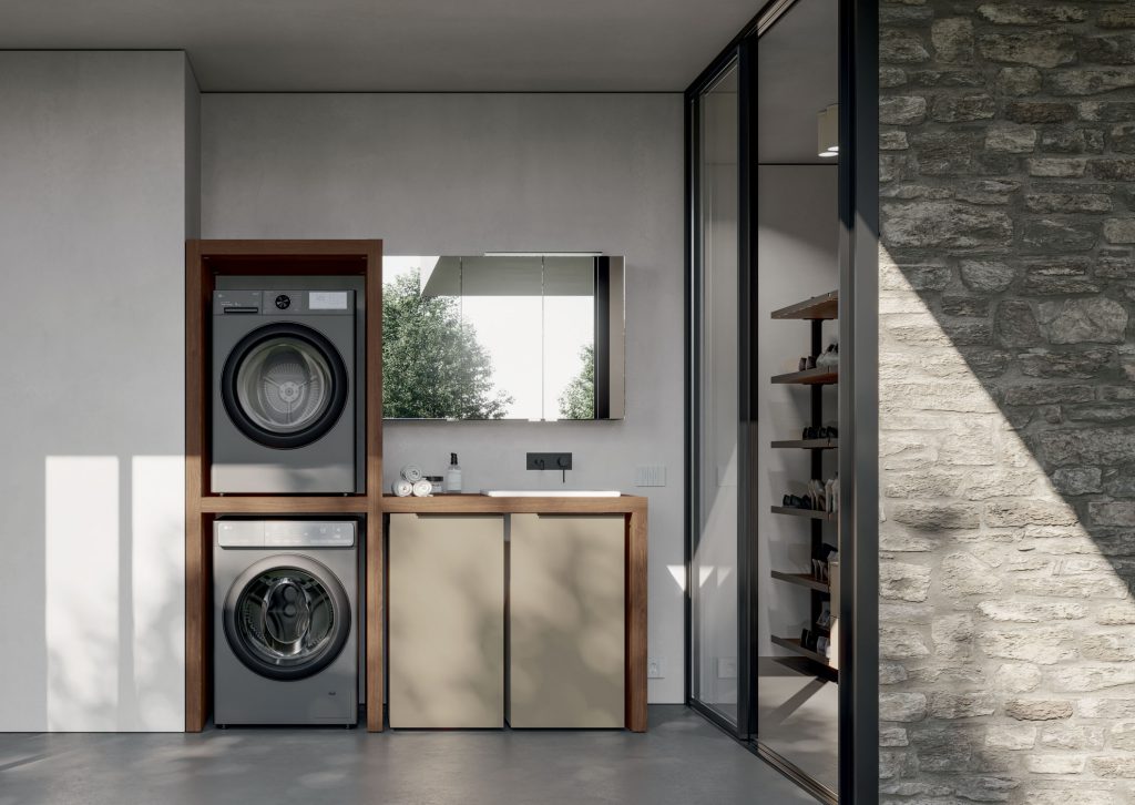 Bei Spazio Time folgt die Kombination aus Bad und Waschküche den aktuellen Tendenzen im Baddesign, wodurch der Raum effizient genutzt wird. Mit der Einführung der Programme „Elemente in Stärke 6 cm“ und „Offene Aufbewahrungssysteme“ können die einzelnen Wohnräume dem vorhandenen Platz und persönlichen Einrichtungsstil angepasst werden.