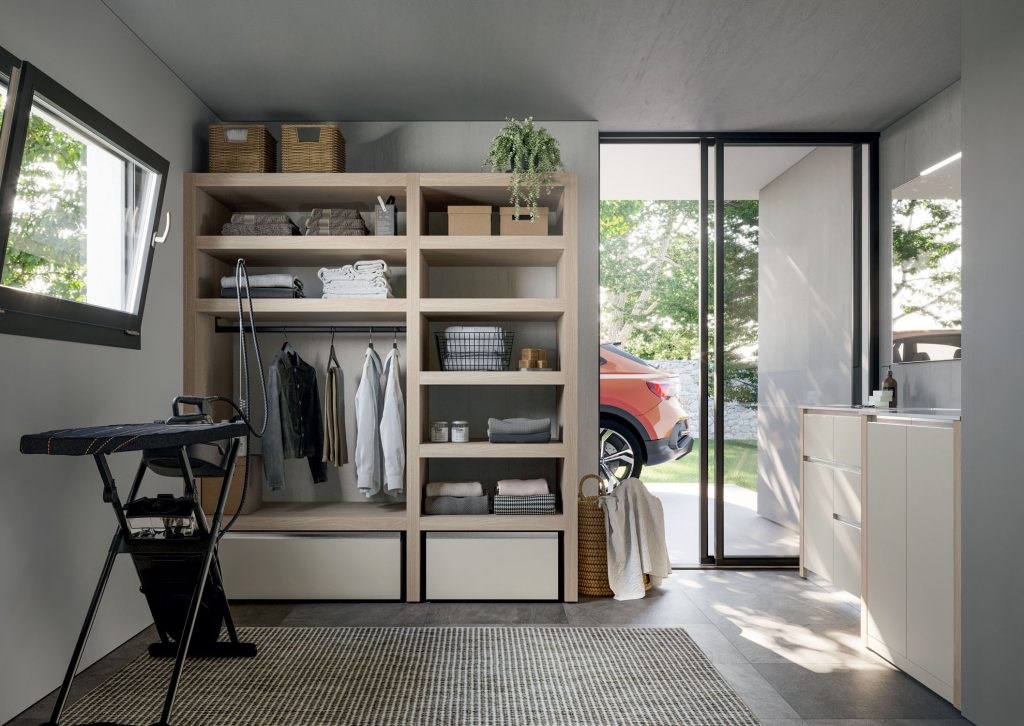 Spazio Time ist eine Kollektion mit funktionalen Möbeln für die Waschküche in modernem Design mit einem umfangreichen Angebot an Ergänzungselementen, Zubehör und offenen Aufbewahrungssystemen. Die perfekte Lösung, um kleine Waschküchen perfekt auszustatten und zu organisieren, selbst wenn der Platz für Waschmaschine und Trockner begrenzt ist.