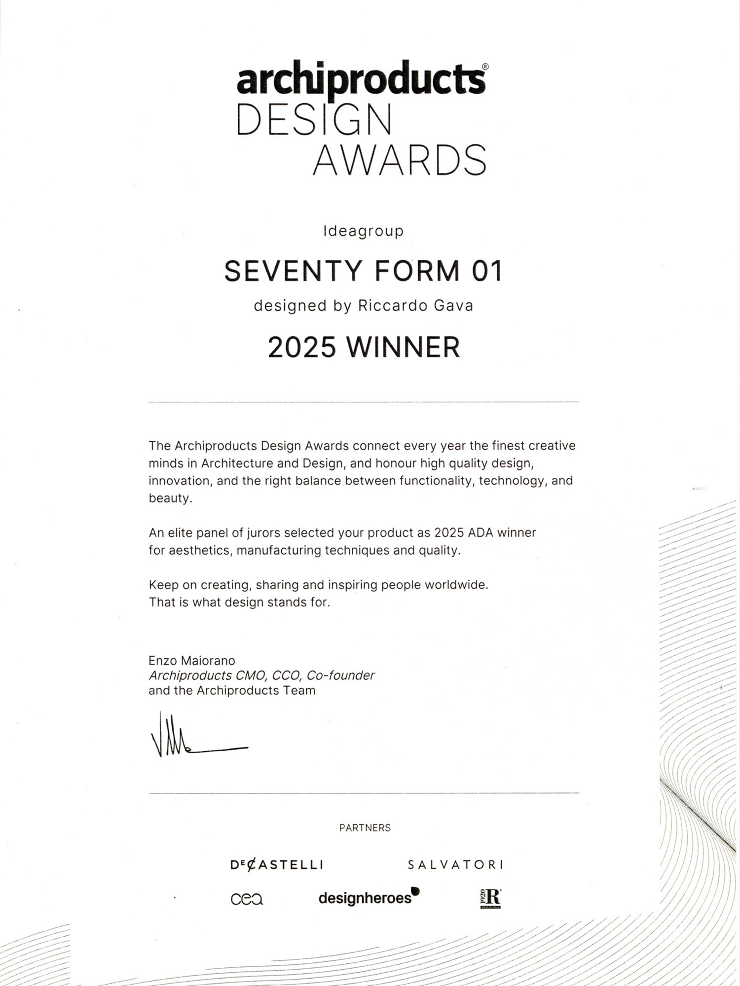 Die von Riccardo Gava entworfene Kollektion Seventy • Form wurde bei den Archiproducts Design Awards 2025 ausgewählt, die herausragende Leistungen im Bereich internationales Design würdigt und Unternehmen und Designer prämiert, denen es gemeinsam gelungen ist, bei ihren Produkten Ästhetik, Funktion und Innovation in Einklang zu bringen, ausgezeichnet.