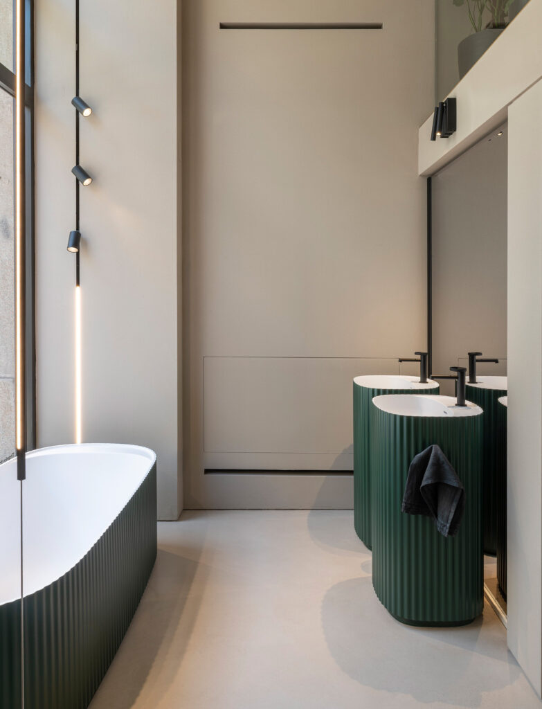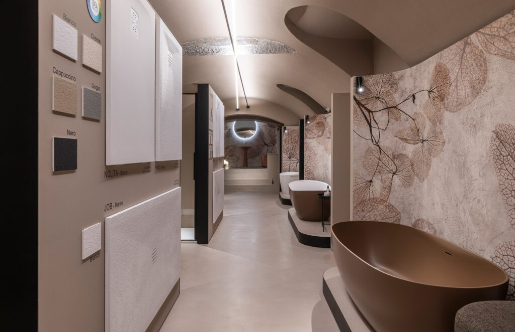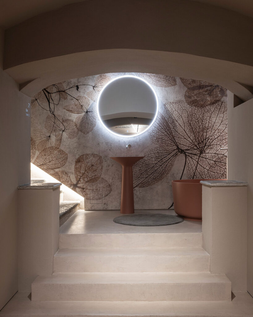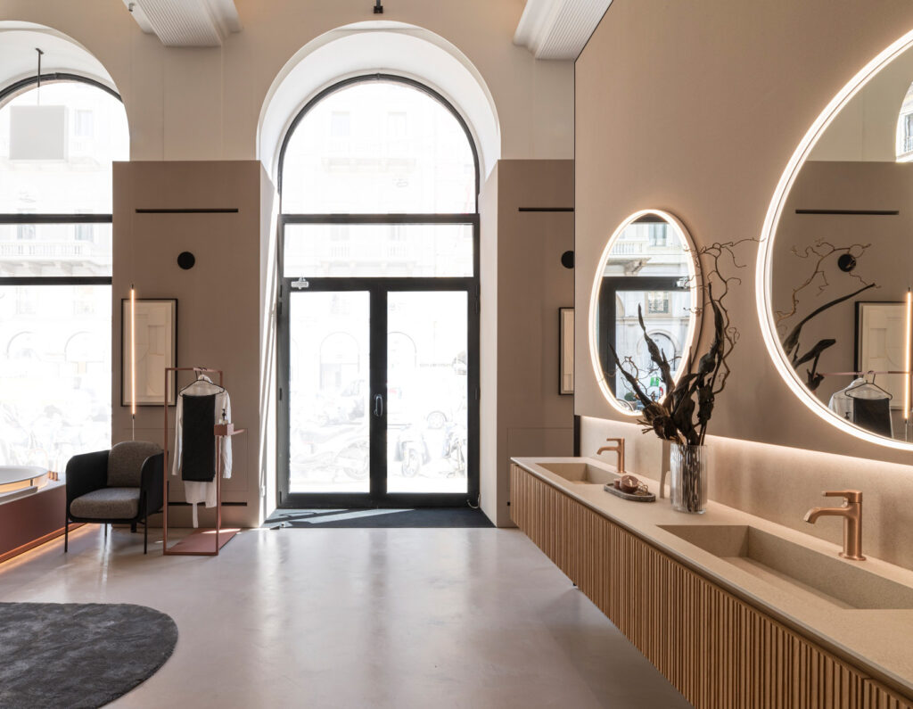 Im Erdgeschoss eines der schönsten historischen Gebäude in Via Manzoni hat Art Director Riccardo Gava unter Berücksichtigung der vorhandenen Räumlichkeiten und der architektonischen Gegebenheiten eine über 300 Quadratmeter große Ausstellungsfläche geplant, die sich über drei Etagen erstreckt. Die neutralen Farben Weiß, Schwarz und Taubengrau verleihen den Räumen Ausdruck und erzeugen stimmungsvolle Szenarien. Nicht nur die Volumen und die komplexe Dreidimensionalität der Räume stehen im Vordergrund, sondern auch die Materialien und ihre vielfältigen Verarbeitungsmöglichkeiten, um das Bad in eine Wellnessoase zu verwandeln. Ein Ort voller Emotionen, der das Potenzial des Angebots von Ideagroup aufzeigt: Von Badmöbeln bis zu Duschkabinen und Duschwannen, von freistehenden Badewannen bis zu Mini- Pools für den Wellnessbereich.