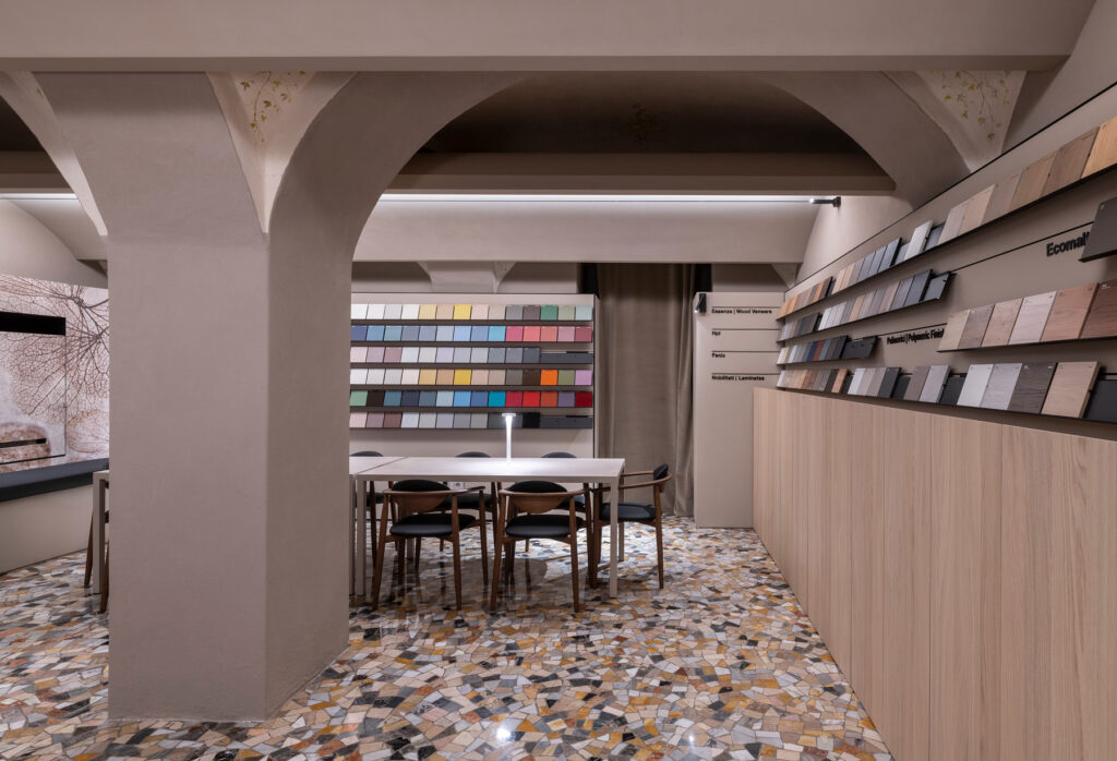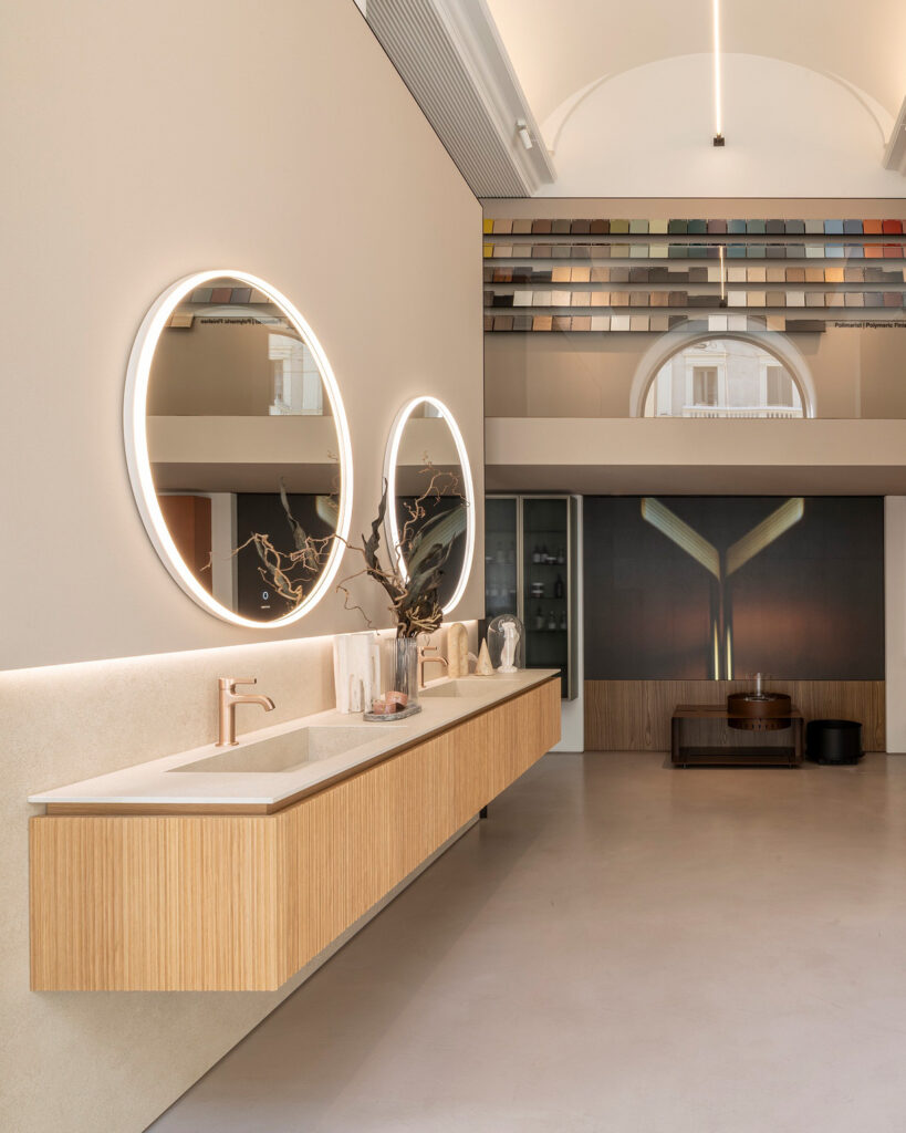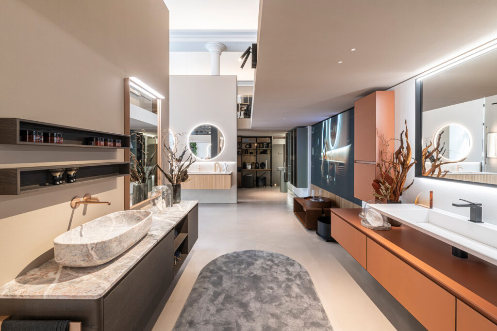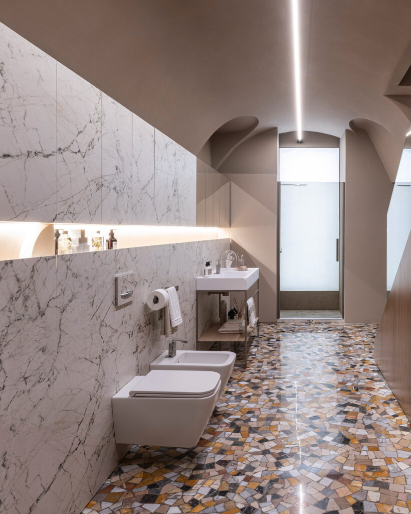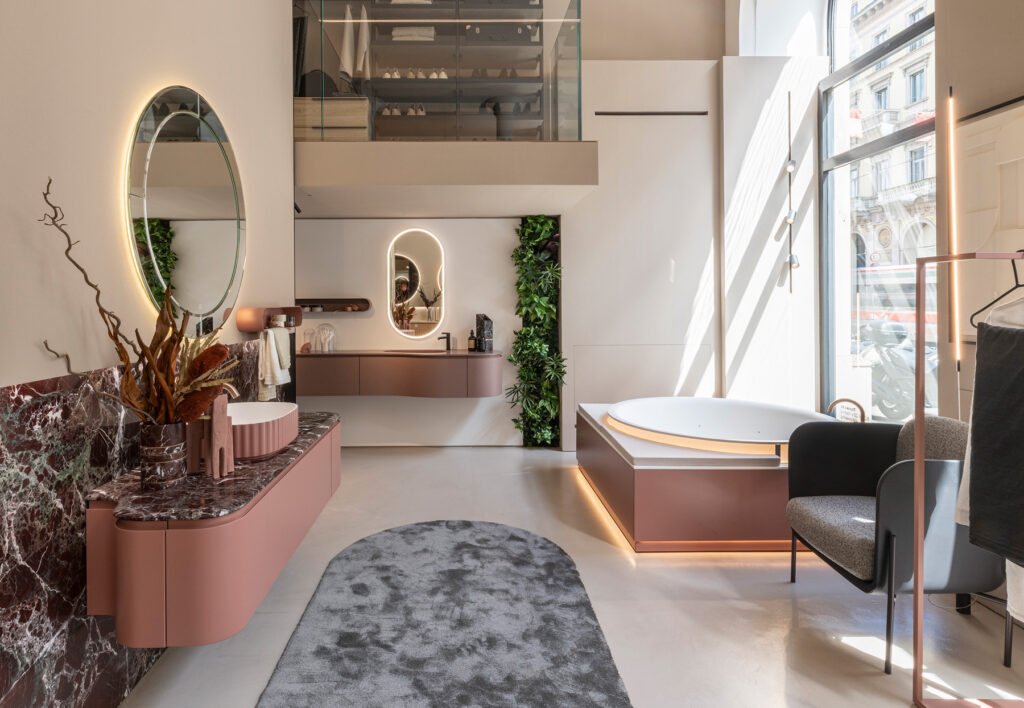 Im Erdgeschoss eines der schönsten historischen Gebäude in Via Manzoni hat Art Director Riccardo Gava unter Berücksichtigung der vorhandenen Räumlichkeiten und der architektonischen Gegebenheiten eine über 300 Quadratmeter große Ausstellungsfläche geplant, die sich über drei Etagen erstreckt. Die neutralen Farben Weiß, Schwarz und Taubengrau verleihen den Räumen Ausdruck und erzeugen stimmungsvolle Szenarien. Nicht nur die Volumen und die komplexe Dreidimensionalität der Räume stehen im Vordergrund, sondern auch die Materialien und ihre vielfältigen Verarbeitungsmöglichkeiten, um das Bad in eine Wellnessoase zu verwandeln. Ein Ort voller Emotionen, der das Potenzial des Angebots von Ideagroup aufzeigt: Von Badmöbeln bis zu Duschkabinen und Duschwannen, von freistehenden Badewannen bis zu Mini- Pools für den Wellnessbereich.